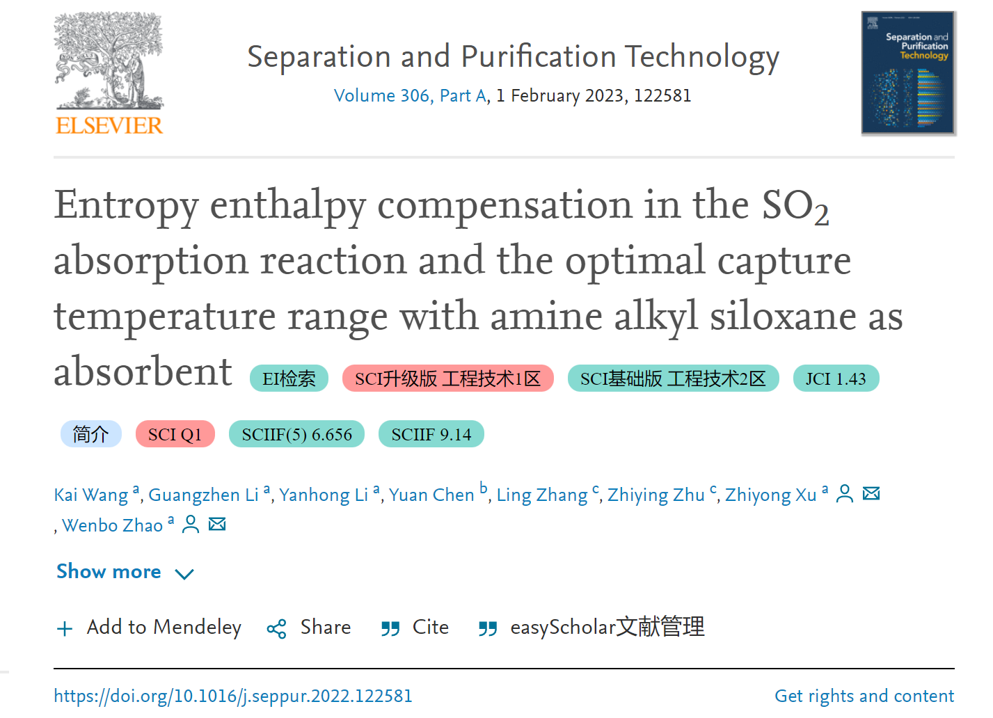 近日,赵文波教授课题组在SO2捕集方面的最新研究成果“Entropy enthalpy compensation in the SO2absorption reaction and the optimal capture temperature range with amine alkyl siloxane as absorbent”在化工领域国际Top学术期刊Separation and Purification Technology上发表。论文的第一作者为javHiHi