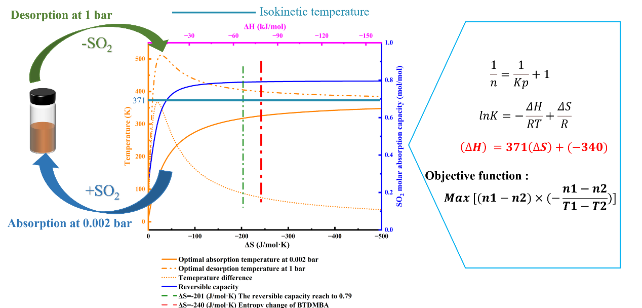 ,其中371K称为等动力学温度。在此基础上,根据最优化函数max((n1-n2)×(-(n1-n2)/(T1-T2)),发现随着反应熵变的减小,最吸收和解吸温差先增大后减小;SO2循环吸收量逐渐增大到0.79 mol/mol时基本不再改变。在吸收压力为0.002 bar,解吸压力为1 bar的条件下,若要满足循环吸收量达到0.79 mol/mol,熵变值最大应为-201 J·mol-1·K-1。上述研究成果可为新型可实用SO2吸收剂的开发提供理论与技术参考。