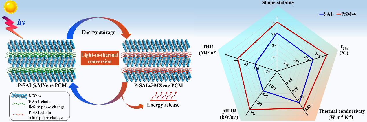磷化工团队提出通过简单的真空浸渍技术将磷改性的硬脂醇吸附到MXene气凝胶中,制备了一种具有阻燃、导热及形状稳定的多功能MXene基复合相变材料。研究结果表明该复合相变材料具有:1)突出的储热能力,且经过200次热循环后仍然保持稳定;2)优异的形状稳定性,在90℃温度下仍然能够保持稳定而不发生泄漏;3)优异的阻燃和自熄灭能力。研究还揭示了MXene与含磷分子在相变材料中的协效阻燃机理。该复合相变材料有望应用于光热能转换和存储的器件和设备,同时对于开发安全高效的多功能相变材料具有重要指导意义。