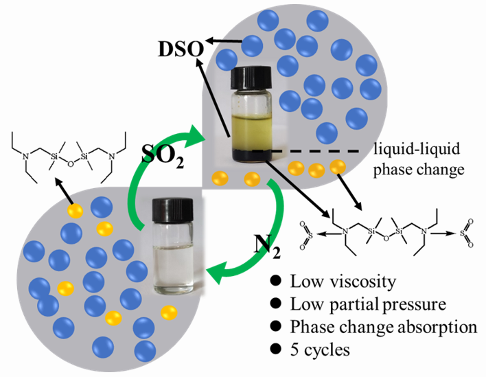 此外,团队通过两步反应合成了一种具有双吸收位点的新型氨基硅氧烷(3-二乙氨基甲基-1,1,3,3-四甲基-二硅氧烷基甲基)-二乙胺(DTDA)。该吸收剂在吸收前后均具有较低的粘度。DTDA的吸收能力可达3.42 mol/mol(303.15 K, 1 atm)。SO2的解吸在363.15 K下可实现,且具有良好的循环吸收性能。此外,随着二甲基硅油(DSO)的引入,获得了具有相变行为的混合吸收体系(DTDA-DSO)。混合吸收系统不仅表现出良好的热稳定性,而且具有较低的热脱附能耗。DTDA-DSO优异的吸收性能使其在SO2捕集领域具有巨大的潜力,可为其工业应用提供有力支撑。