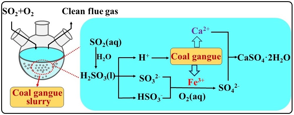 全球煤炭产量约80亿吨/年,中国约占50%,是世界上最大的煤炭资源消费国。然而,煤炭的燃烧过程会释放出大量的SO2,导致酸雨、雾霾等环境问题。为此,研究者们开发了上百种脱硫技术,但工业化运用的仅有几十种。目前,烟气脱硫技术主要存在经济运行成本较高、固液二次污染等问题,亟待开发绿色、低成本的脱硫技术。近年来,利用工业固体原料/废弃物为吸收剂脱除燃煤烟气中的SO2污染物已受到学者广泛关注。煤矸石是煤炭开采和洗选过程中产生的固体废物,中国的煤矸石储量和年增长量分别达到4.5-5亿吨和0.37-0.55亿吨,是世界上煤矸石储量最大的国家。鉴于此,本团队发明了一种利用煤矸石作为脱硫剂脱硫的新方法,可以实现固体废物资源化利用和SO2污染物治理的双重目标。在这篇论文中,研究了工艺操作条件对SO2吸收率的影响,优化了脱硫工艺操作参数,实验表明煤矸石浆具有较好的脱硫性能,脱硫容量可达33.12 g SO2/L煤矸石浆。此外,根据对脱硫过程中气、液、固三相物质组成的分析,确定了脱硫活性物质和产物。煤矸石中溶解的Fe3+对SO2的有效吸收有显著影响。SO2在水中溶解形成的HSO3-在微量Fe3+的催化作用下可迅速转化为SO3自由基,从而诱导SO5•−、SO4•−、HO2、HO等活性氧化物质,促进SO2向SO42-的转化,实现高效脱硫,这项研究对煤矸石浆脱硫技术的工业化应用具有重要的指导意义。