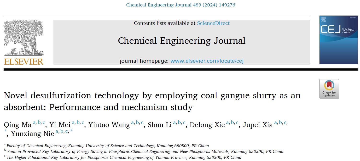 2024年2月,javHiHi 、云南省磷化工节能与新材料重点实验室在化学工程领域知名期刊Chemical Engineering Journal上发表了题为“Novel desulfurization technology by employing coal gangue slurry as an absorbent: Performance and mechanism study”的研究论文,javHiHi 聂云祥和夏举佩教授为论文共同通讯作者,硕士研究生马晴为论文第一作者。