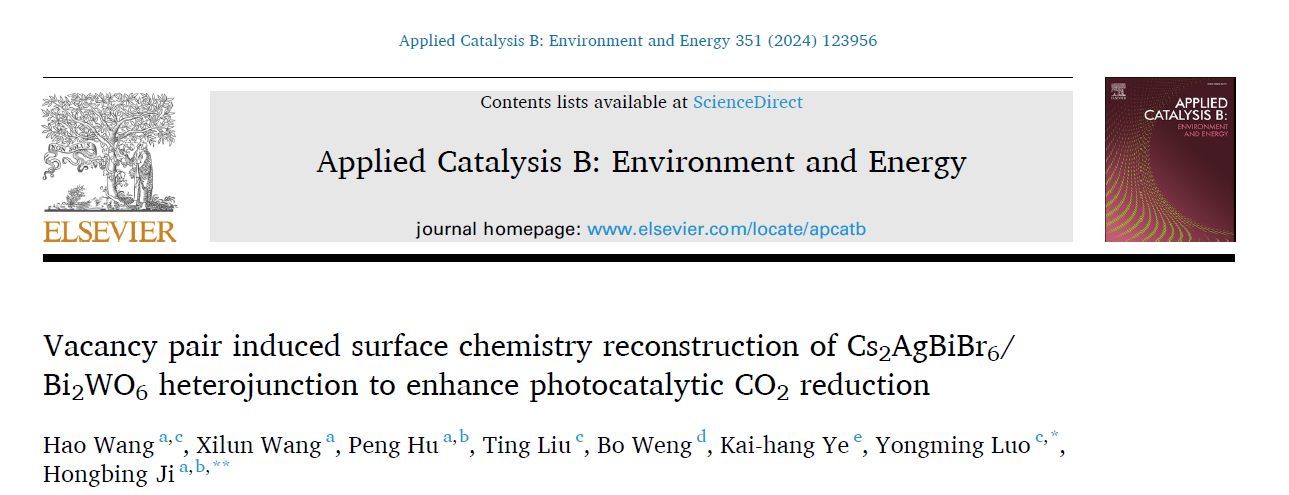 先进环境功能材料罗永明教授团队联合中山大学纪红兵教授团队围绕二氧化碳催化转化制备甲烷反应中缺陷限域型异质结催化剂设计的最新研究成果“Vacancy pair induced surface chemistry reconstruction of Cs2AgBiBr6/Bi2WO6heterojunction to enhance photocatalytic CO2reduction”在环境催化领域著名学术期刊Applied Catalysis B: Environmental and Energy(IF=22.1)发表。论文第一作者是javHiHi
