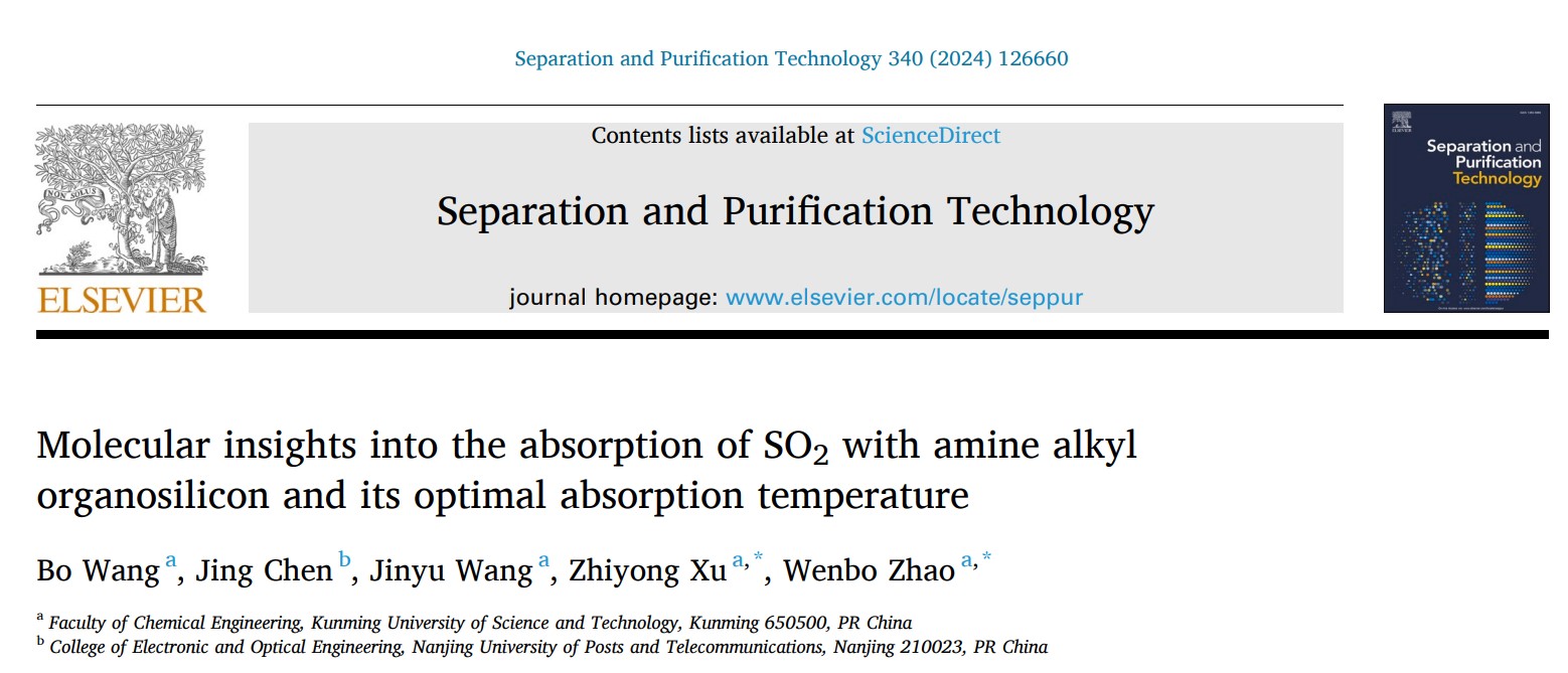 分子分离与催化赵文波教授团队在SO2气体捕集领域取得新研究进展。相关成果以“Molecular insights into the absorption of SO2with amine alkyl organosilicon and its optimal absorption temperature”和“Fabrication of metal oxides-based adsorbents for SO2capture with equimolar adsorption”为题分别发表在化工一区TOP学术期刊《Separation and Purification Technology》和《Chemical Engineering Journal》上。