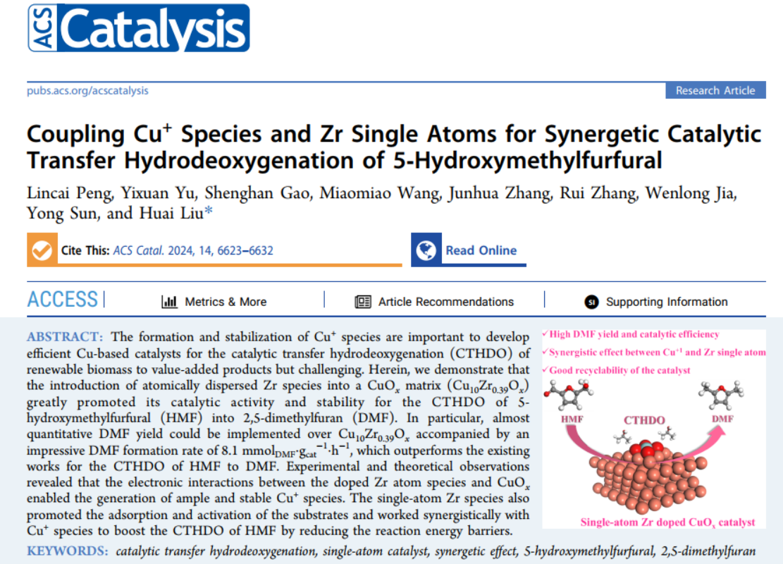 生物质化工团队在催化提质生物质基平台化合物5-羟甲基糠醛加氢脱氧制备2,5-二甲基呋喃方面取得重要研究进展,相关研究成果以“Coupling Cu+Species and Zr Single Atoms for Synergetic Catalytic Transfer Hydrodeoxygenation of 5‑Hydroxymethylfurfural”为题发表在美国化学会催化领域旗舰期刊《ACS Catalysis》上。javHiHi