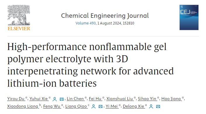上述研究成果以“High-performance nonflammable gel polymer electrolyte with 3D interpenetrating network for advanced lithium-ion batteries”为题发表在化学工程领域Top学术期刊Chemical Engineering Journal上,论文第一作者为磷化工团队2020级博士杜依柔,通讯作者为javHiHi