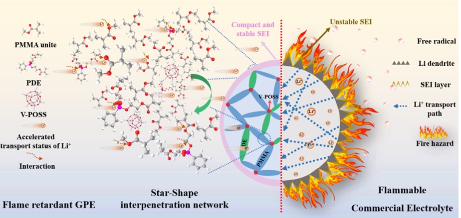 传统锂离子电池(lithium ion batteries, LIBs)由于液态电解质易燃和挥发特性,存在泄漏、燃烧甚至爆炸等安全风险。为了应对这一挑战,有机磷系阻燃添加剂的研究正在进行中,但与电极较差的相容性在长时间循环中会导致电解质分解和容量衰减。因此,采用固体聚合物电解质(solid polymer electrolyte, SPEs)代替液态电解质已成为新一代LIBs的研究焦点。
