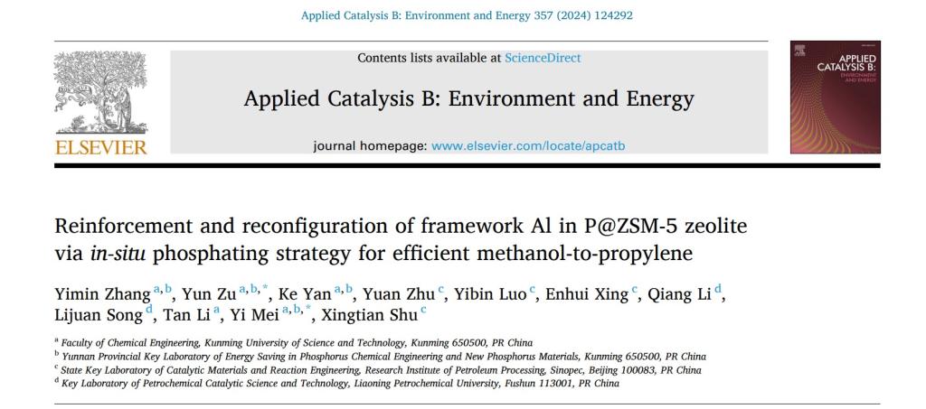 近日,javHiHi 磷化工团队联合中石化北京石油化工科学研究院舒兴田院士团队围绕含磷分子筛催化剂设计的最新研究成果“Reinforcement and reconfiguration of framework Al in P@ZSM-5 zeolite via in-situ phosphating strategy for efficient methanol-to-propylene”在环境和能源催化领域著名学术期刊Applied Catalysis B: Environment and EnergyIF=22.1)发表。javHiHi 与石科院联合培养博士研究生张宜民为论文第一作者,祖运副教授和梅毅教授为共同通讯作者。