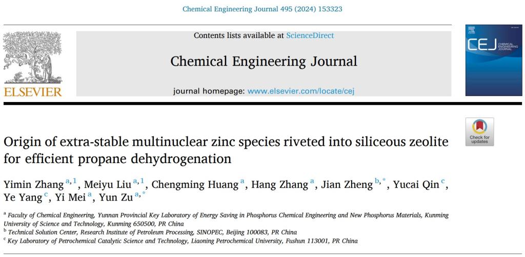 研究进展一:javHiHi 磷化工团队联合辽宁省石油化工催化科学与技术重点实验室围绕丙烷脱氢锌基分子筛催化剂设计的最新研究成果“Origin of extra-stable multinuclear zinc species riveted into siliceous zeolite for efficient propane dehydrogenation”在化工领域著名学术期刊Chemical Engineering Journal(IF=13.3)发表。博士研究生张宜民和硕士研究生刘美玉为论文共同第一作者,通讯作者为祖运副教授。