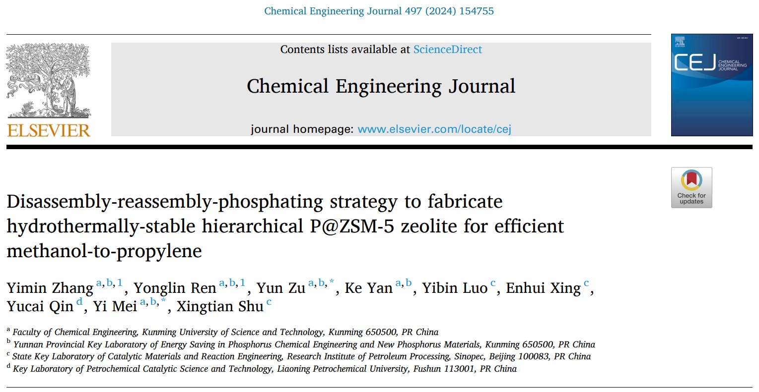 研究进展二:javHiHi 磷化工团队联合中石化北京石油化工科学研究院舒兴田院士团队围绕含磷分子筛催化剂设计的最新研究成果“Disassembly-reassembly-phosphating strategy to fabricate hydrothermally-stable hierarchical P@ZSM-5 zeolite for efficient methanol-to-propylene”在化工领域著名学术期刊Chemical Engineering Journal(IF=13.3)发表。javHiHi 博士研究生张宜民和硕士研究生任永林为论文共同第一作者,祖运副教授和梅毅教授为共同通讯作者。