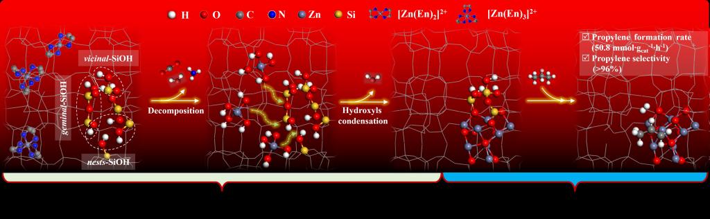 锌基催化剂因其价格低廉、环境友好的特点,在丙烷直接脱氢制丙烯(PDH)方面具有广阔的应用前景,但在工作条件下,面临着活性锌成分的损耗严重等问题。鉴于此,本团队通过热重-质谱和原位傅立叶变换红外光谱技术,首先成功打开了一个“黑匣子”—纯硅(S-1)分子筛中活性Zn形态的起源。基于此,在邻对硅羟基和硅醇巢的辅助下,通过中间体Zn(OH)x的可控转化,将单位点、多核和纳米羟基化的ZnOx物种分别封装到S-1分子筛孔道中。令人欣喜的是,所合成的m-ZnOx@S-1分子筛催化剂在PDH反应中展现出令人羡慕的丙烯生成速率(50.8mmol∙gcat-1∙h-1)和丙烯选择性(>96%)。最重要的是,经过7次循环再生后,催化活性恢复如初,并且没有锌的损失。这种优异的PDH性能得益于低配位和超稳定的多核ZnOx物种,大大降低脱氢能垒,有利于PDH反应产生丙烯和氢气。这些发现阐明了锌基分子筛催化剂催化PDH反应的发展潜力,并为替代型PDH催化剂的优化提供了后续借鉴。