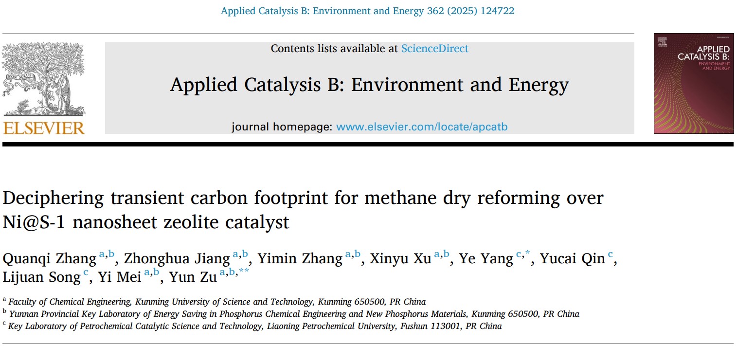 近日,javHiHi 磷化工团队祖运副教授、梅毅教授联合辽宁省石油化工催化科学与技术重点实验室宋丽娟教授团队围绕破译甲烷干重整在镍基纳米片分子筛催化剂上瞬态碳足迹的最新研究成果“Deciphering Transient Carbon Footprint for Methane Dry Reforming over Ni@S-1 Nanosheet Zeolite Catalyst”在环境和能源催化领域著名学术期刊Applied Catalysis B: Environment and Energy(IF=20.2)发表。javHiHi 为论文第一通讯单位,2022级硕士研究生张全淇为论文第一作者,祖运副教授为论文通讯作者。