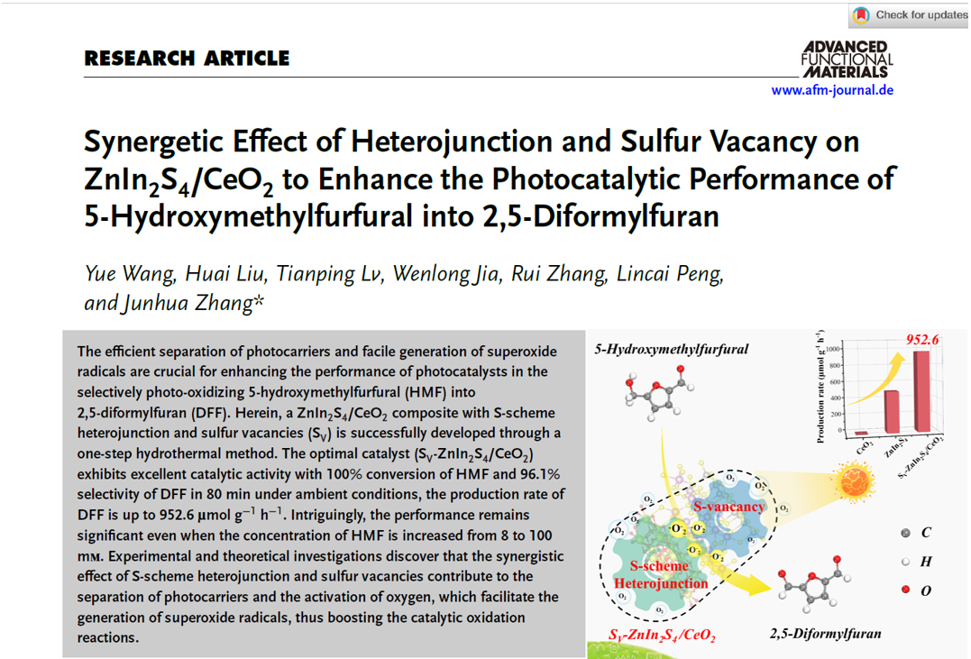 生物质化工团队在新型光催化材料设计并用于生物质平台分子光氧化升级方面取得重要研究进展,相关研究成果以“Synergetic Effect of Heterojunction and Sulfur Vacancy on ZnIn2S4/CeO2 to Enhance the Photocatalytic Performance of 5‐Hydroxymethylfurfural into 2,5‐Diformylfuran”为题发表在材料科学领域国际权威TOP学术期刊《Advanced Functional Materials》(IF=18.5)上。javHiHi