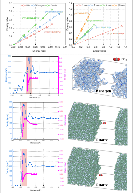 (2)吸附相密度的动态演化特征与主控机制:吸附相密度显著受控于矿物类型(伊利石 > 干酪根 > 石英)、孔径(反比于孔隙尺寸)、温度(反比于温度)和压力(正比于压力)。干酪根基质(有机相)表面粗糙度越高,吸附层越厚但密度峰值越低;石英(无机相)表面粗糙度导致CO2-石英间流固作用势能曲线区别于CO2与光滑石英表面间的作用势能曲线。