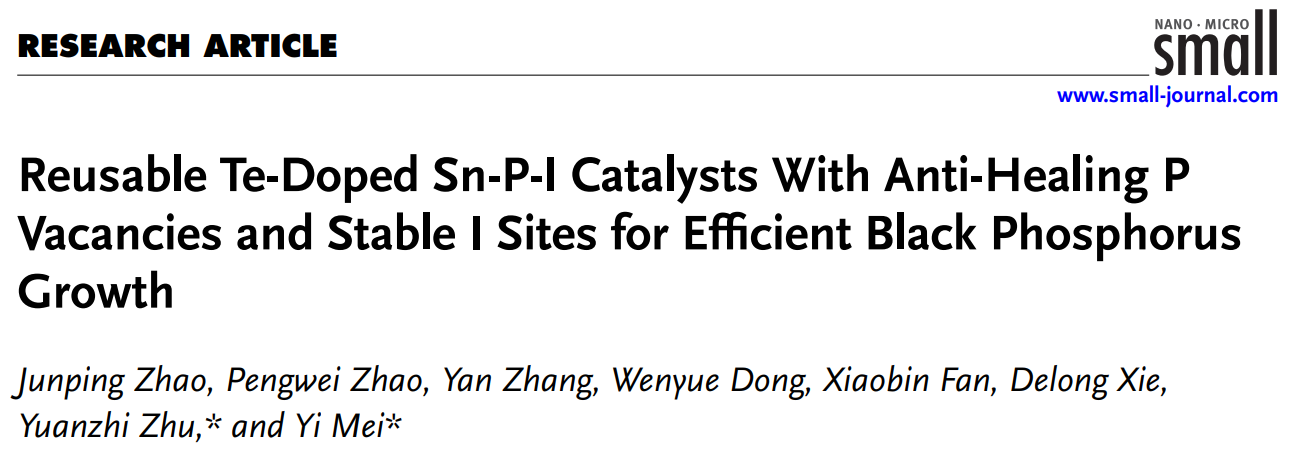 近日,javHiHi 磷化工团队梅毅教授、朱远蹠副教授围绕具有抗愈合磷空位和稳定碘位点可重复使用的碲掺杂锡磷碘催化剂用于高效黑磷生长的最新研究成果“Reusable Te-Doped Sn-P-I Catalysts With Anti-Healing P Vacancies and Stable I Sites for Efficient Black Phosphorus Growth”在工程技术-材料科学领域学术期刊small上发表。