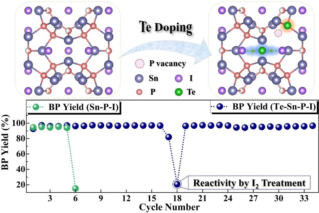 基于此,磷化工团队设计了一种掺杂碲(Te)策略,合成了高效且稳定的Te 掺杂 Sn-P-I 催化剂(Te-Sn-P-I)。研究表明,掺杂Te后形成了Sn-Te 键使得Te-Sn-P-I结构生成抗修复的磷空位,大幅提高了催化活性位点,同时由于Te较低的电负性有效抑制了碘的流失,从而显著提升了催化活性和循环稳定性。优化后的 Te-Sn-P-I 催化剂将黑磷的总反应时间从15h缩短至仅需45min,黑磷产率高达96.7%。此外,开发出采用碘蒸气活化的方式重新激活失活Te-Sn-P-I的催化活性,该再生过程能实现催化活性的100%恢复,使催化剂的使用寿命提升至34次循环。进一步提出了Te-Sn-P-I结构中P空位和碘位点作为两个关键活性位点,揭示了P空位和碘位点协同催化黑磷生长的作用机制。这些发现为黑磷的形成机制提供了新见解,有助于推动高效且低成本黑磷催化剂的合理设计。