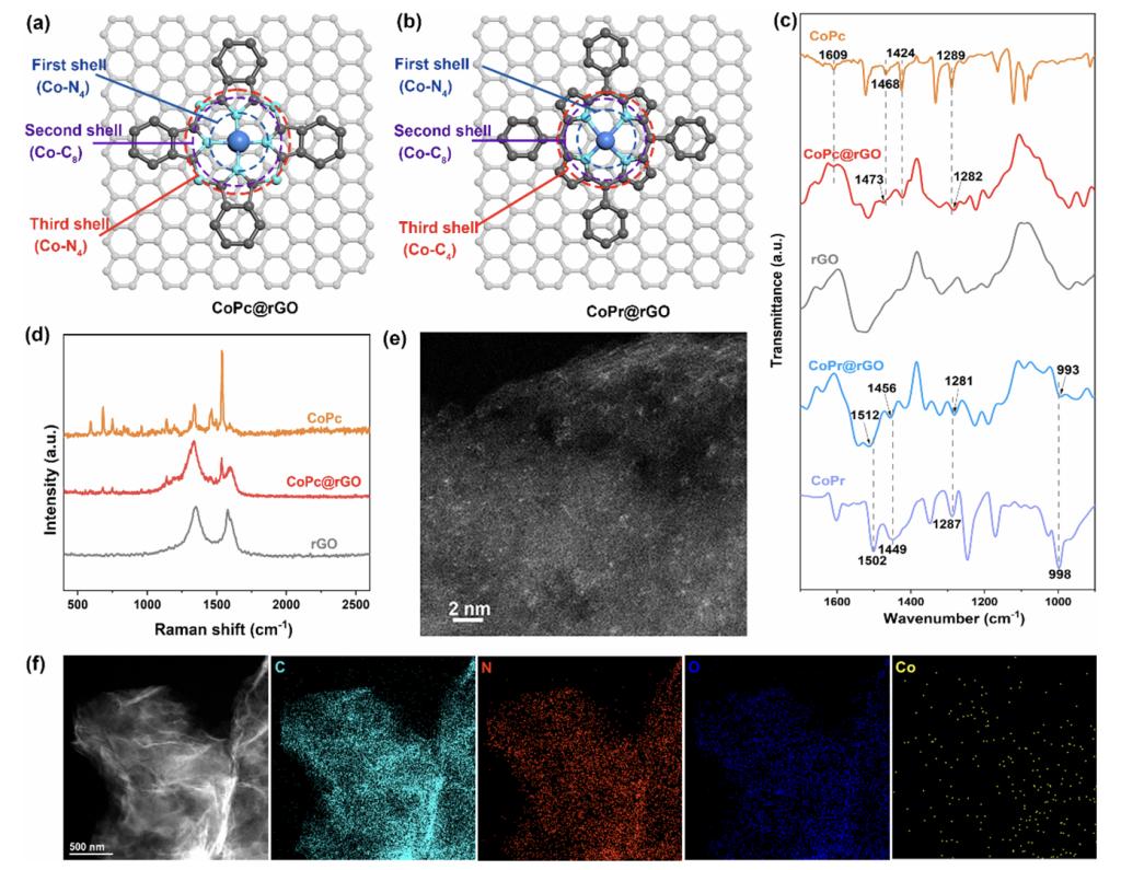 针对这一挑战,本研究创新地提出采用结构明确的分子模型催化剂,以探究ORR性能与结构之间的构效关系。研究选取了具有相同第一壳层Co-N4与第二壳层Co-C8但第三壳层结构不同的钴酞菁(CoPc,第三壳层Co-N4)与钴卟啉(CoPr,第三壳层Co-C4)分子,通过π-π耦合作用将其锚定在导电基底还原氧化石墨烯(rGO)上,构建了CoPc@rGO和CoPr@rGO分子模型催化剂。实验结果显示,有第三壳层N修饰单原子Co-N4活性位点的转化频率(TOF)为7.36 e−1 site-1 s-1,为普通单原子Co-N4活性位点(2.34 e−1site-1s-1)的3倍多。此外,密度泛函理论(DFT)计算揭示,第三壳层N可以调节Co-N4位点的电子结构,并降低ORR的反应能垒。最后,在锌空气电池中应用,相比于CoPr@rGO,CoPc@rGO也表现出更好的电池性能。