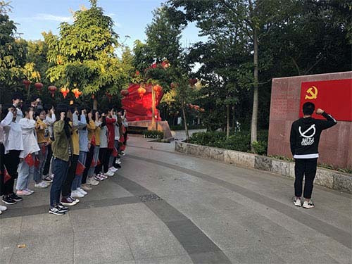此次党日活动共有四项流程。第一项流程,“走中国革命道路,学习中国革命精神”。学生第一党支部书记杨欢带领党员同志回顾中国革命史,从中共一大召开到武昌起义、秋收起义、井冈山精神、长征精神、中华人民共和国成立等,我们党用时间证明我们的道路是正确的,我们当代党员也应该在我们革命先烈铺就的道路上坚定不移地走下去;第二项流程,“缅怀革命先烈,致敬革命英雄”。所有支部党员在革命烈士纪念碑前奏唱《国歌》,致敬英雄,我们今天的生活离不开他们昨日的奋斗,正是因为有了他们,我们才有今日的稳定生活;第三项流程,“不忘入党初心,重温入党誓词”。所有同志面向党旗,庄重宣誓,我们党员应时刻不忘入党初心,牢记入党誓词,时刻保持党员应有的觉悟及信仰;第四项流程,“不忘初心,牢记使命”主题教育学习竞赛。学生第一、第四党支部所有党员同志就“不忘初心,牢记使命”主题教育学习问答题进行抢答。