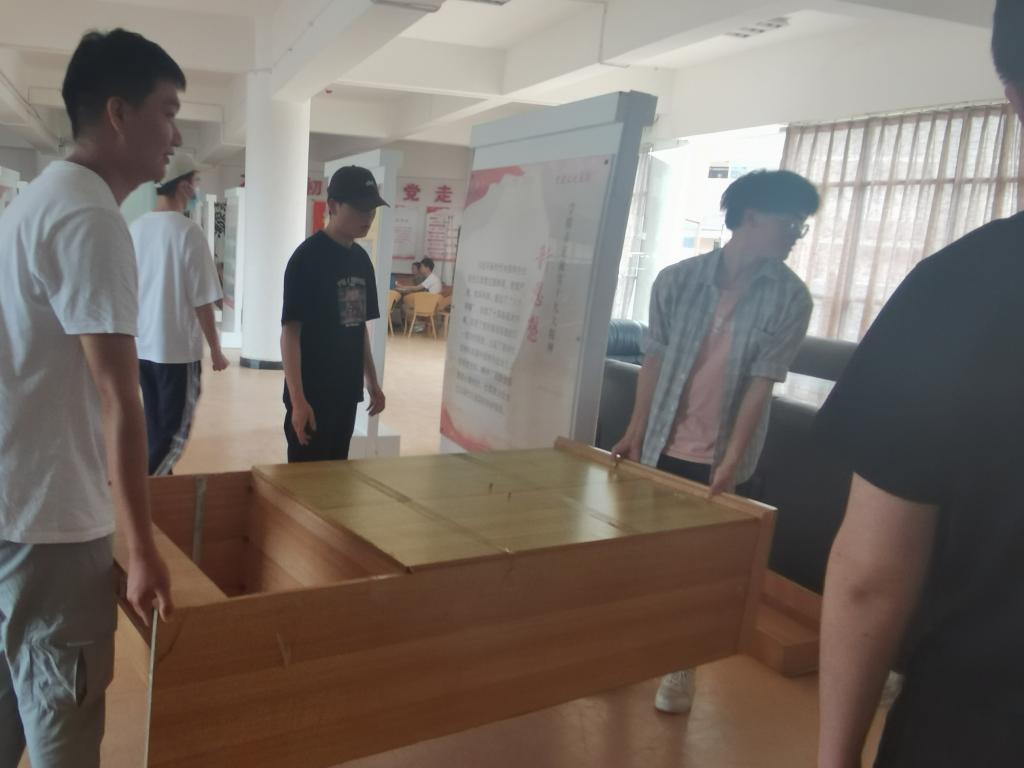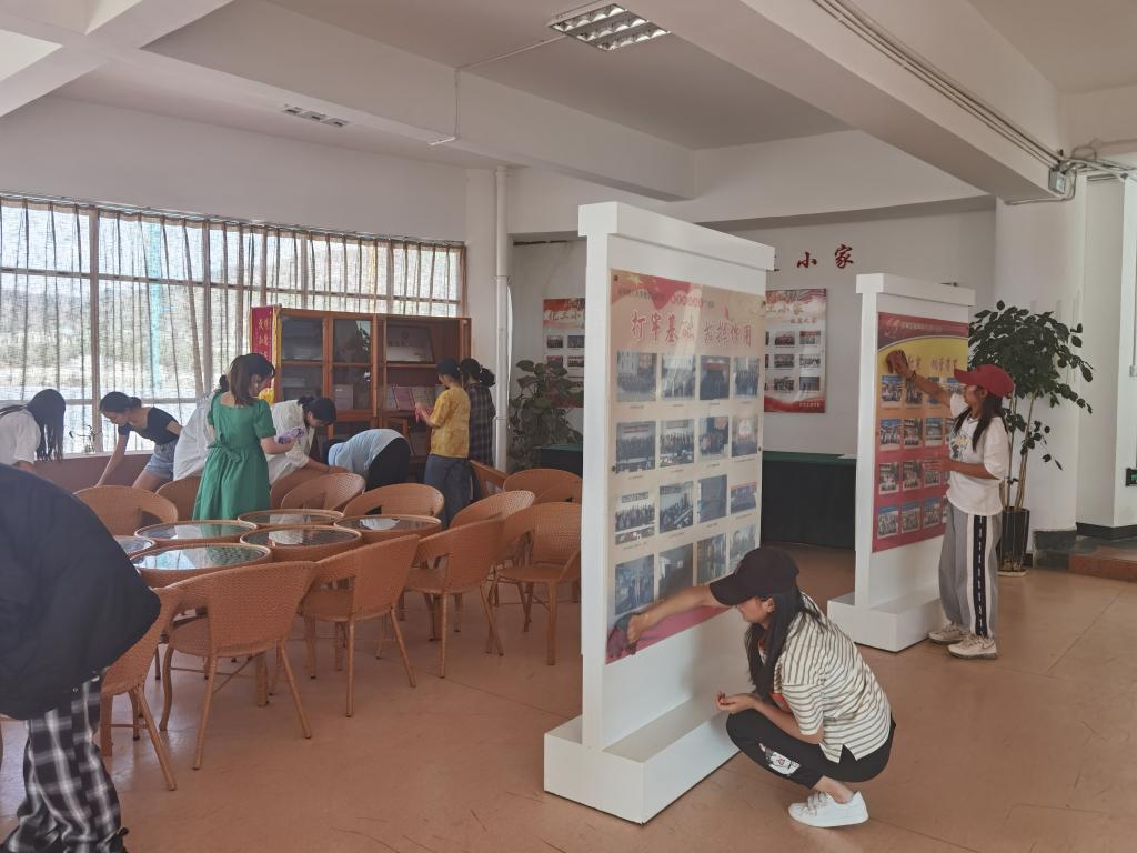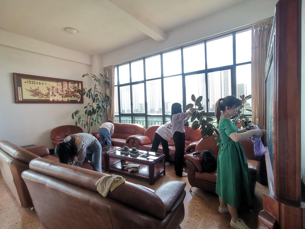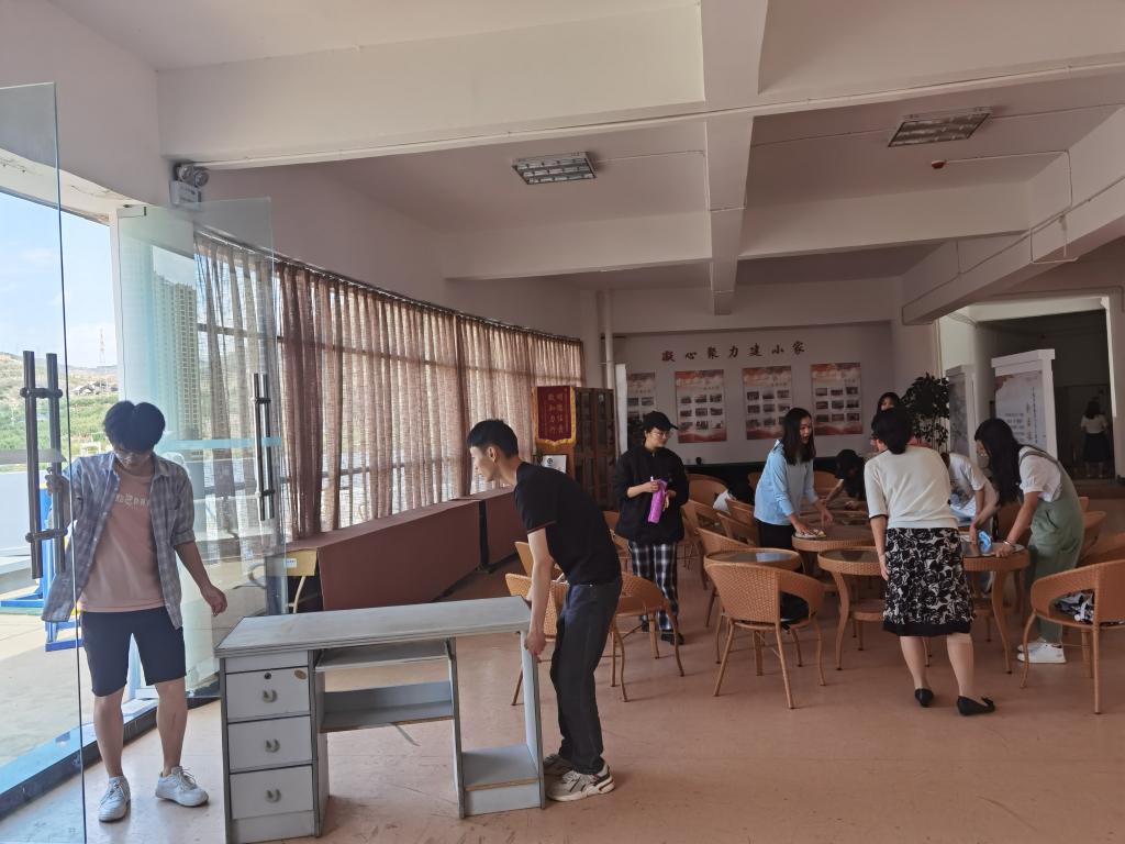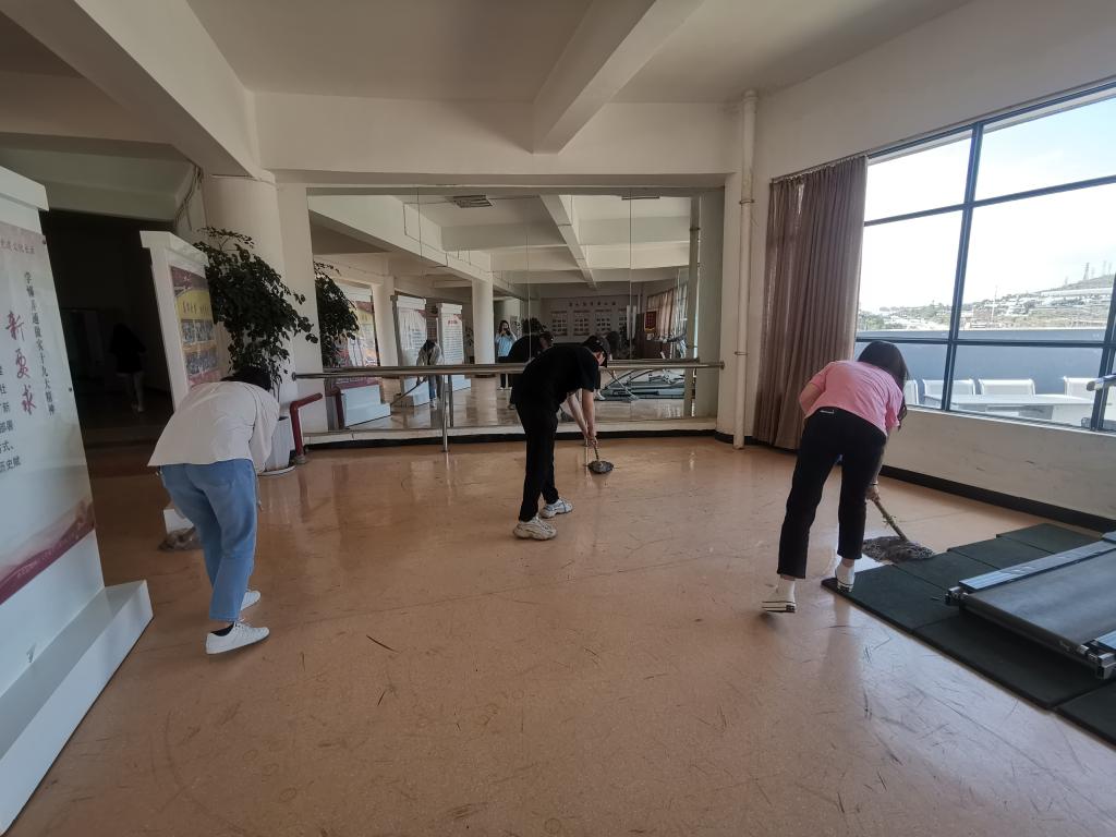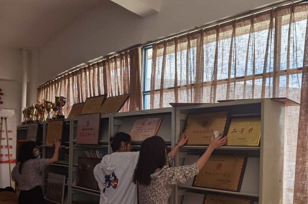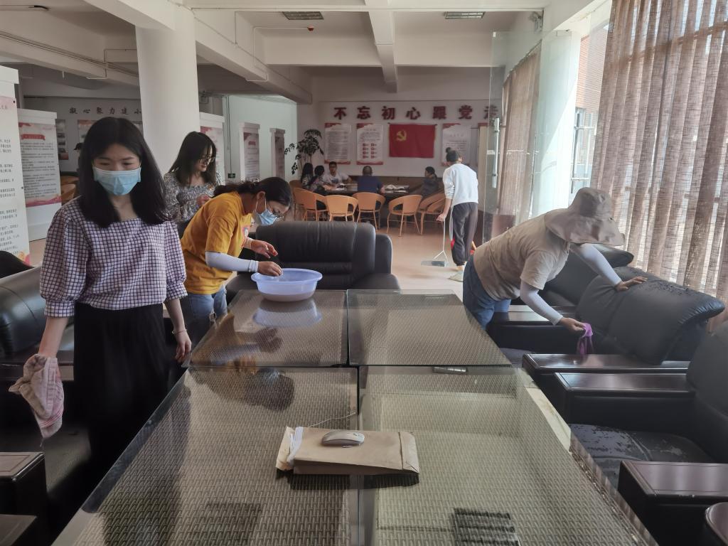 活动中,学生党员们分工合作,男生党员四人一组,负责整理三楼平台的柜子和桌椅。女生党员用自己带来的扫帚、抹布、拖把等劳动工具相互配合,分别清扫门窗、镜子、桌椅、地板等。