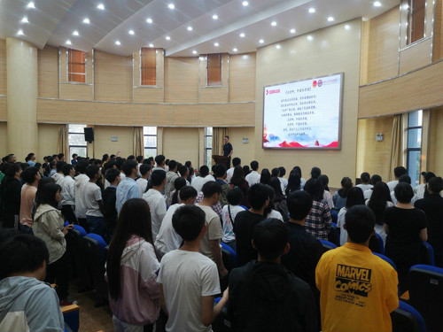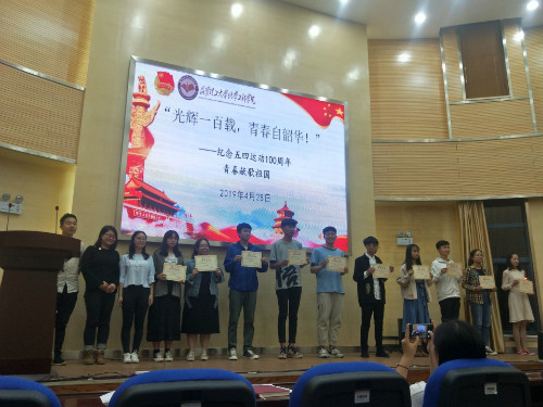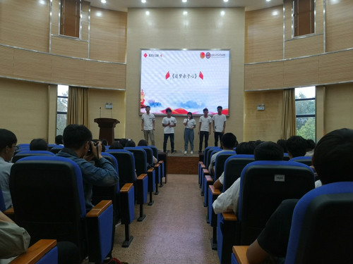 团委、学生会联合院青年志愿者协会在化工楼100报告厅举办了“光辉一百载,青春自韶华”五四青春献歌祖国活动,本次大会有学工办主任袁敬老师、团委李凯宇老师、谭宏雪老师、17级辅导员杨欢老师、18级辅导员罗晓菲老师和现场一百多位观众同学参加,并由院团委、学生会文艺部部委林雨主持。