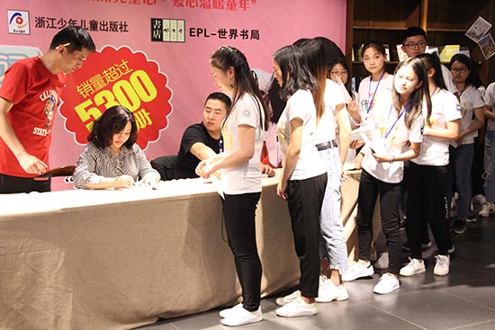 杨老师刚刚抵达活动现场,便围来了很多小朋友给杨老师献花,杨老师到现场入口处签到墙上签名后,热情地与小朋友们拍照合影留念。紧接着杨老师便径直走向正式售书签名处,家长在工作人员的指引下,纷纷为小孩子挑选、购买书籍,然后找杨老师要签名,并合影留念。