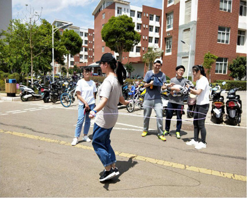 呈贡校区,活动地点共分为七站,分别为公教楼站、恬园站、憬园站、怡园站、建工楼站、明理楼站和昆工一号门站,每个站点均有不同的游戏,各队伍完成该站游戏,方可出发去下一站。活动游戏包括:指压板运球、接力跳绳500、合力踢毽子60、合力吹气球、蒙眼探秘一号门,全部通关后的队伍在公教楼草坪进行3v3撕名牌比赛,绿色的草坪上,同学们本着“友谊第一、比赛第二”的原则,团结协作、认真努力地争取胜利,不时还传来欢声笑语。