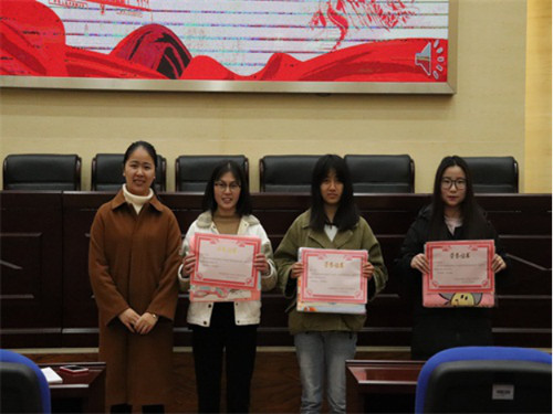 经过分数的核算,最后进行的是颁奖仪式,左虎同学荣获一等奖、田景媛等三位同学荣获二等奖、苗钰函等五位同学荣获三等奖、叶彬等十一位同学荣获优秀奖,金雯老师和团委、学生会的主席班子们为各位获奖同学颁奖,并合影留念。