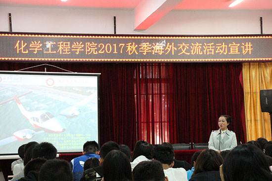 的海外交流项目,详细讲解了优秀本科经济困难生、优秀本科生、研究生分别要拥有什么条件以及要通过什么样的审核,才能借助学校平台,走出国门,通往海外,增长更多的见识。随后陈老师就适合化工学子交流的佛罗里达理工学院和北亚利桑那大学做详细介绍,同学们被深深吸引,期待有朝一日自己能够到海外求学,拓展本领。