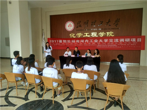 2017年暑期赴越南河内工业大学交流调研项目出征仪式在化工楼如期举行。院党委副书记李云燕老师、国际学院陈美芝老师、学工办主任袁敬老师、博士带队教师何艳萍老师和12名项目成员共同参与,出征仪式由李凯宇老师主持。