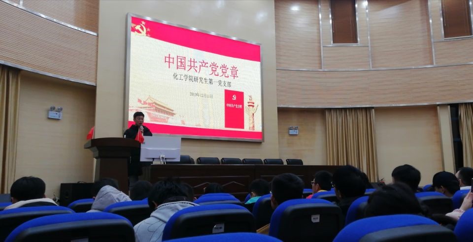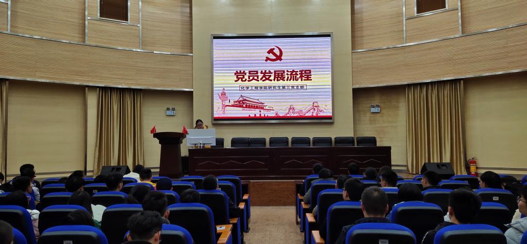 研究生第一、二、三党支部于化工楼100报告厅开展“为大家讲解党员发展程序相关问题”培训。大会由第三党支部书记江梦同志主持,参会人员有第一党支部书记韩涛同志、第二党支部书记母维宏同志、第三党支部书记江梦同志以及全体入党申请人和入党积极分子。
