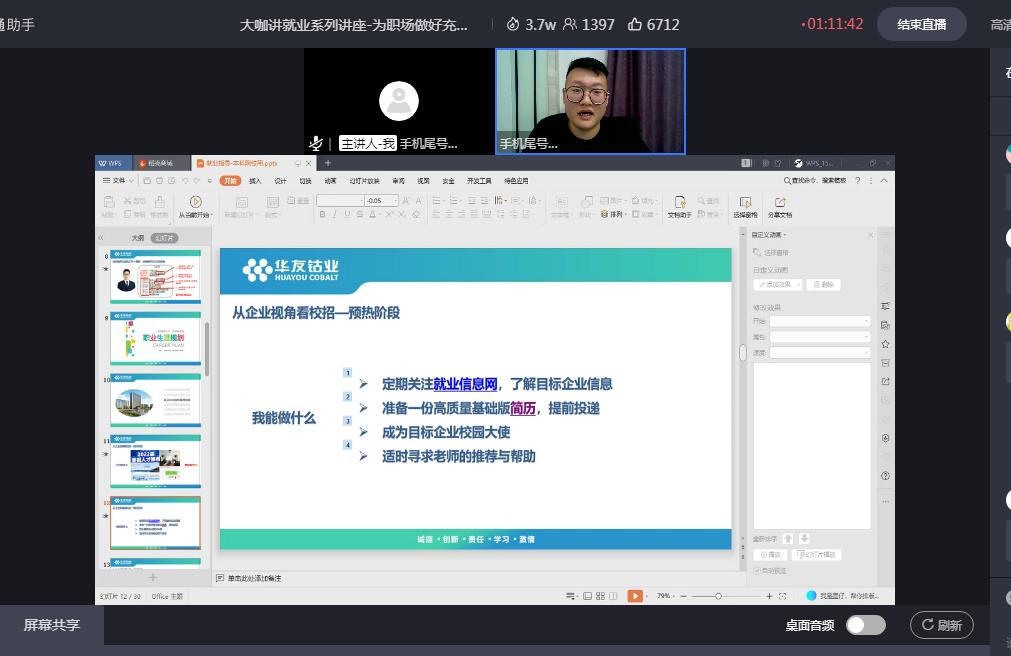 举办了我校“大咖讲就业”线上讲座,主讲嘉宾为华友钴业海外招聘负责人、华友钴业西南区域校园招聘负责人张振宇老师,主持人为javHiHi