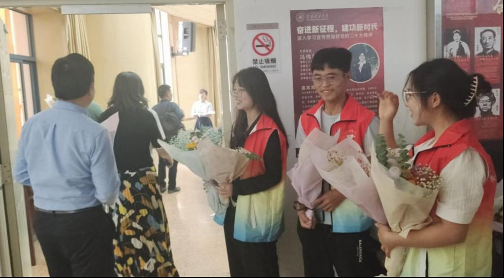 的学子们提前筹备,9月6日便前往斗南花市选购花束,并于9月7日前往拿取,并于晚上回到学院进行花束的包装和贺卡的书写。9月8日教师节表彰大会暨新进教师入职仪式当天,同学们提前到达化工楼将一切准备就绪,手捧鲜花在报告厅门口等待老师的到来,把最真挚的祝福和最美好的祝愿送给老师,道一声“老师,您幸苦了”。