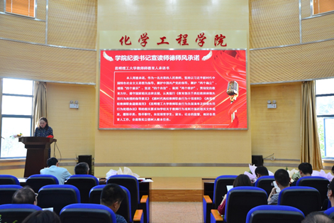 在化工楼100报告厅举行“庆祝第39个教师节表彰大会暨新进教师入职仪式”,学院领导班子、全体教职工、学生代表参加大会。会议由学院党委书记李云燕主持。