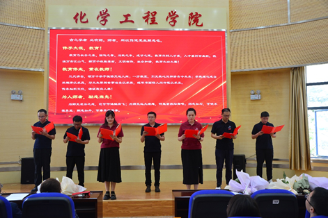 新入职青年教师朗诵《教师赋》:“巍巍教坛,茫茫学海,鹰飞鱼跃,海阔天宽。为师者当不懈奋斗,勤学不辍,精教不止,期大音,跃龙门。百年桃李绽放天下春,千古红烛永远照人间!”