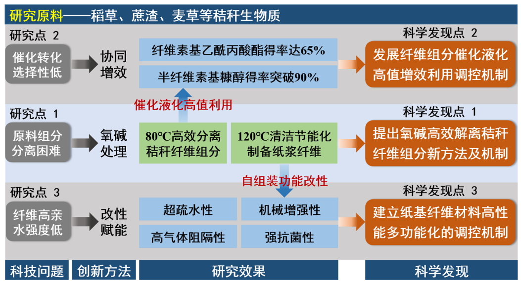 项目针对秸秆生物质高值资源化利用过程中存在原料解构及组分分离难、转化选择性低、纤维高亲水强度低等共性科学问题,依托国家自然科学基金面上、青年等5项国家级项目,开展了秸秆类纤维清洁高效分离、催化转化与功能化高值利用及其调控机制研究。团队历经近十年的研究攻关,提出了氧碱高效解离秸秆组分新机制,实现了秸秆纤维的高效分离与纸浆纤维的清洁节能化制备,发展了纤维组分催化转化定向制备酯类和呋喃类高值能源化学品以及纸基纤维材料高强度超疏水多功能改性的调控机制,建立了秸秆生物质高值高效资源化利用新途径,研究具有重要科学意义和应用价值。评价认为:“该成果在氧碱高效解离秸秆组分及其高值化调控机制研究方面创新性显著,达到国际领先水平”。