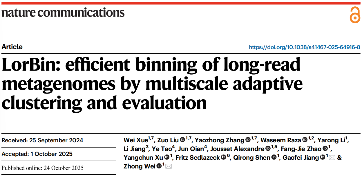 2025年10月24日,《自然—通讯》(Nature Communications)在线发表我院薛卫副教授BioAI实验室与资环学院沈其荣院士团队LorMe实验室的交叉学科研究成果《LorBin: Efficient binning of long-read metagenomes by multiscale adaptive clustering and evaluation》。该工作聚焦生物信息学底层算法,以三代宏基因组分箱为切入点,研发了多尺度自适应聚类与迭代评估算法LorBin,解决了宏基因组研究过程中重构单菌基因组数量少、质量差的共性难题。该研究积极响应了我院重组后关于将人工智能深度融入并赋能农业应用基础研究的重要部署,为我校推动AI赋能的前沿交叉学科建设与发展提供了有力支撑。
